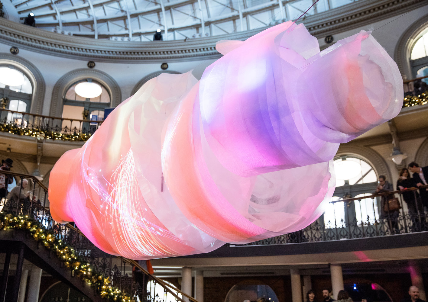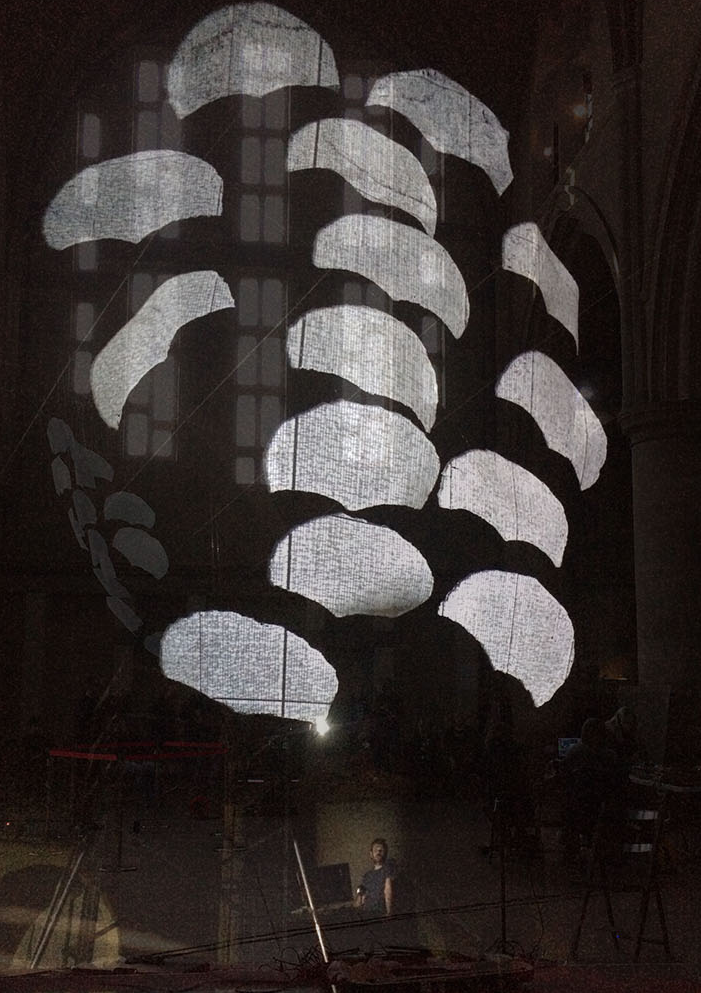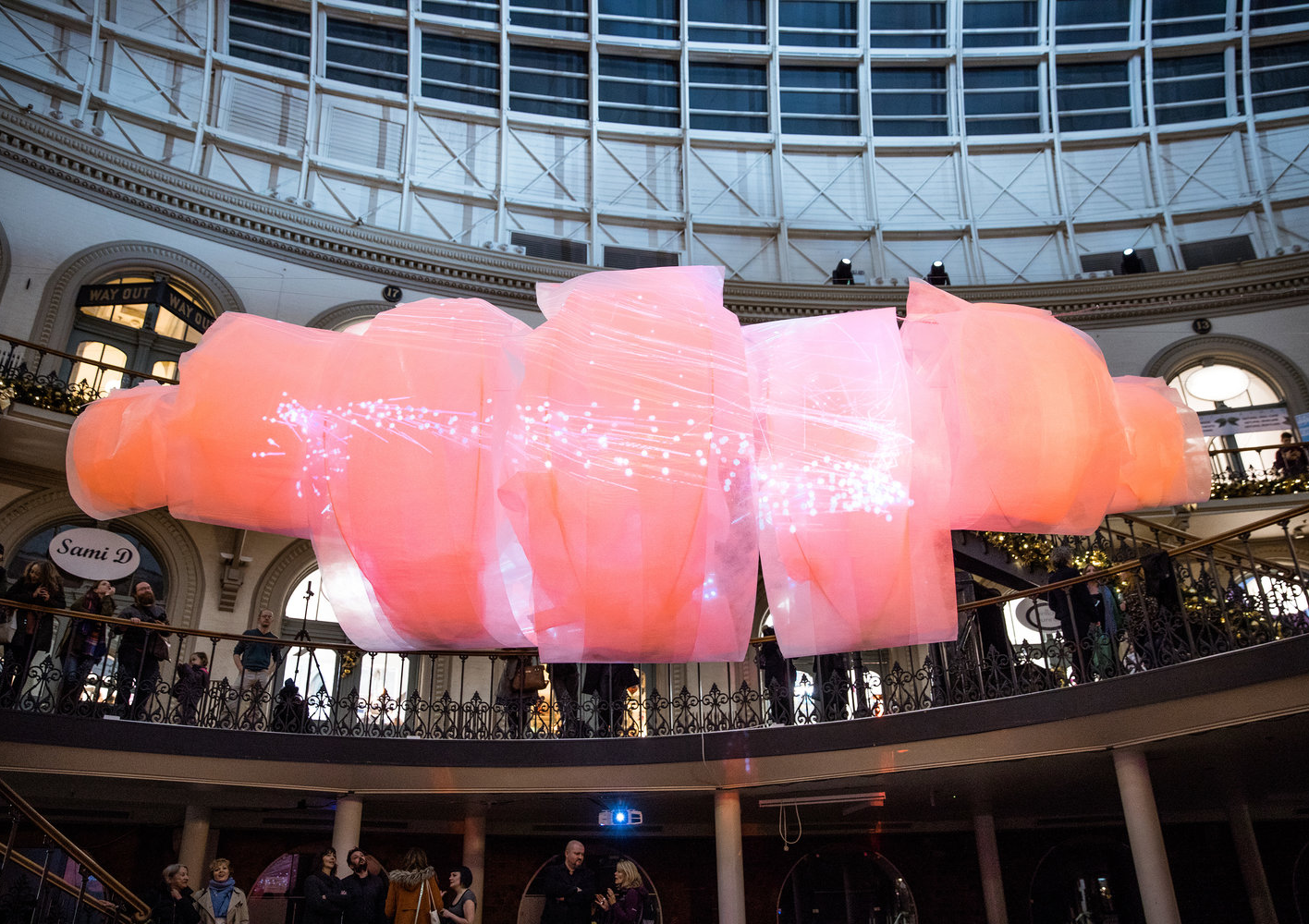 Sound responsive, projection-mapped fibre-glass sculpture commissioned by Leeds BID. At its core, The Murmuration cloud is a testament to the transformative potential of sound as an artistic medium. Inspired by the mesmerizing spectacle of murmurations in nature, the installation seeks to evoke a similar sense of collective movement and unity through sound and light.