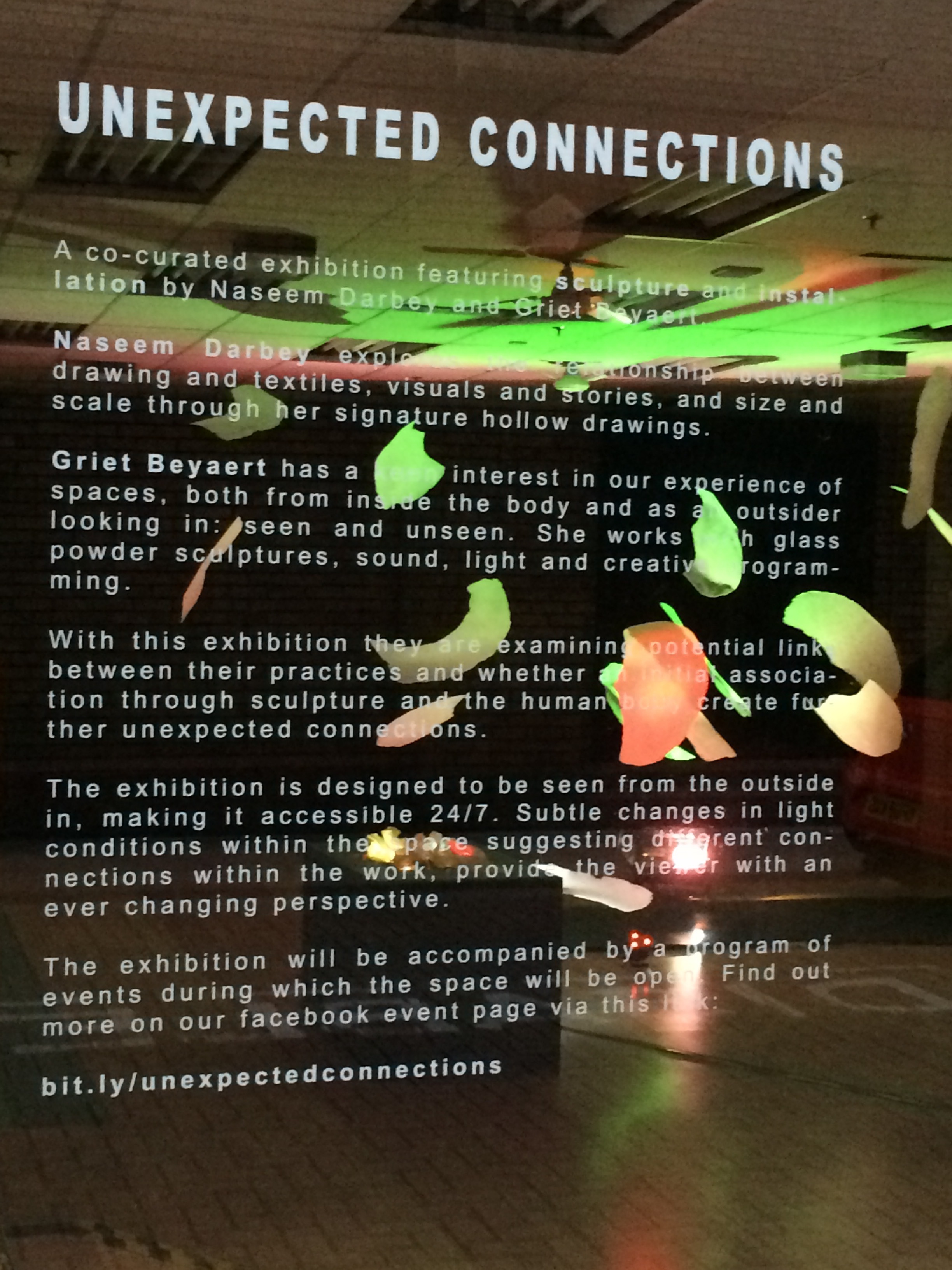 Darbey's visual art, characterized by intricate patterns, textures and light juxtaposed with the sculptural glass and sound installation by Beyaert created a space where the two practices converged and complemented each other in unexpected ways.